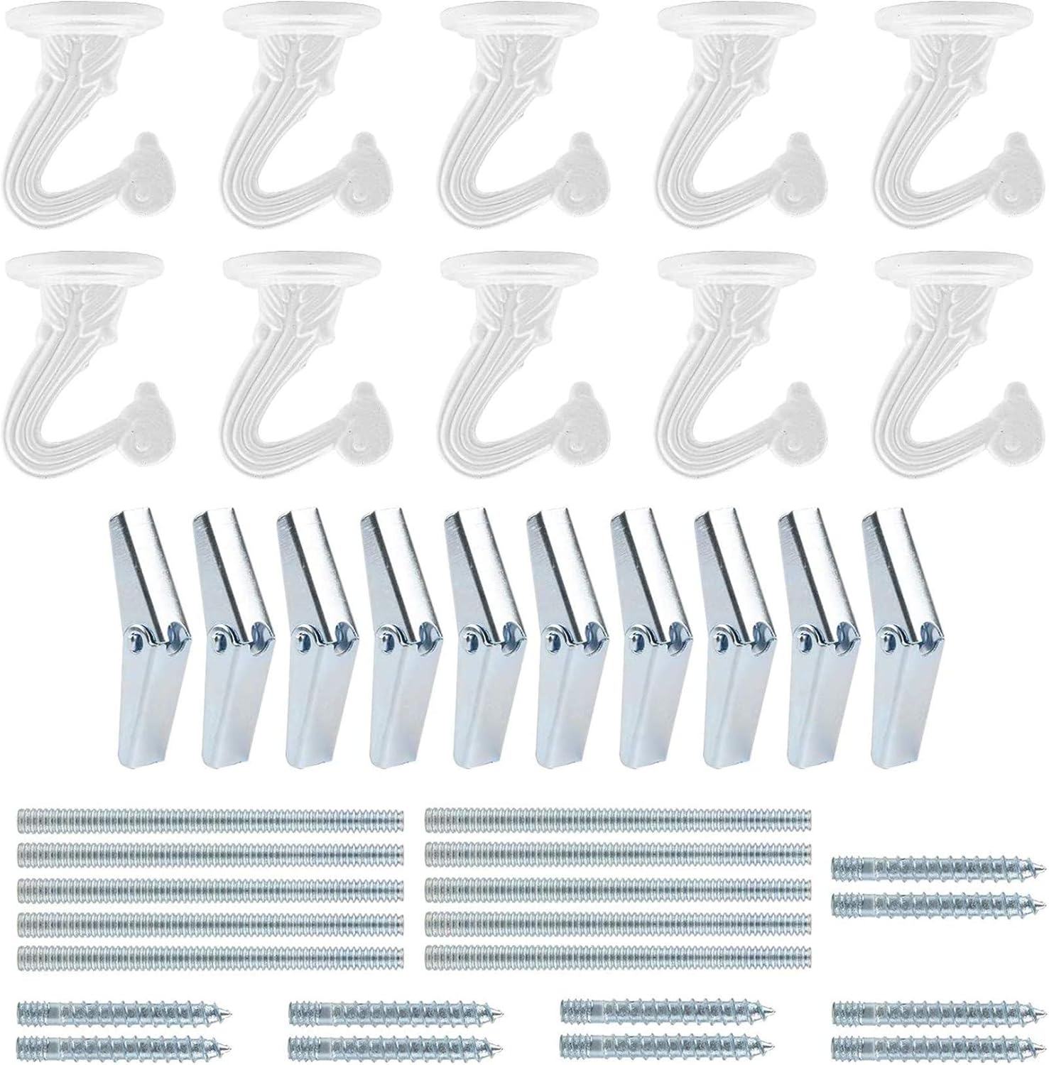 • Plant Hooks for Ceiling Quantity: White swag hook, 10 sets of ceiling hooks, 4 different hardware part of 1 set.ceiling hook for plants, including ceiling swag hooks, metal bolts, zinc plated screws, spring toggle wings, a total of 40 pieces, ceiling hanging hooks enough for your use.